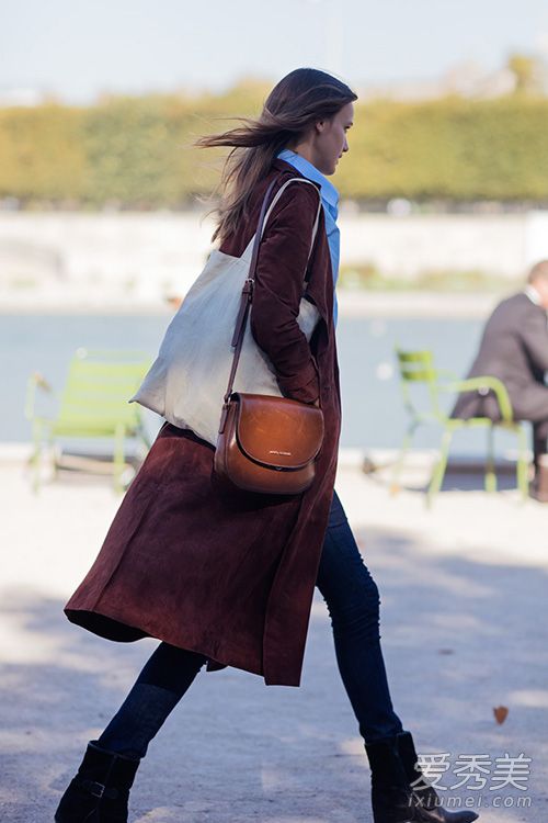 除了经典的卡其色、米色,酒红色也别有一番风情,麂皮元素也尚在流行中,搭配衬衫、紧身裤、短靴,非常利落潇洒。