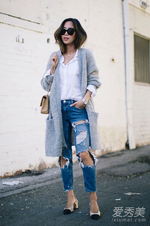 小清新的毛衣外套也不可或缺,简约的浅灰色毛衣外套配白色衬衫和破洞牛仔裤,清新知性的look,破洞牛仔裤增添帅气街头范,更具个性。