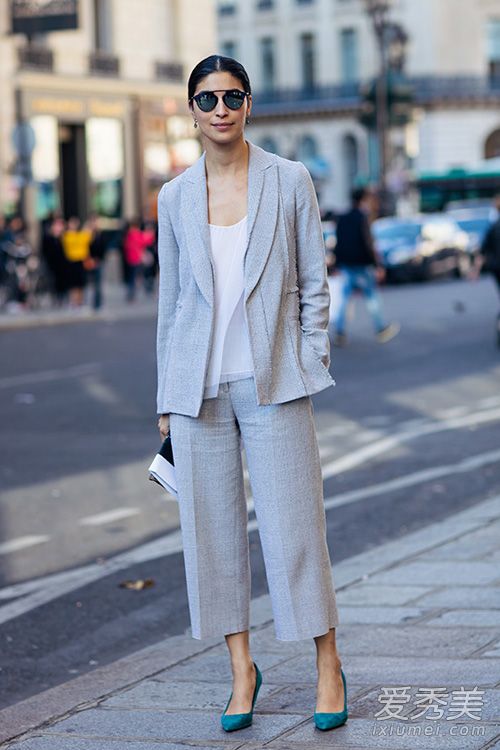 今春可以试试小西装套装,简约大气的浅灰色小西装配七分裤,微微的阔腿设计,平添飘逸潇洒的味道,配亮色高跟鞋精致优雅,女人味十足。