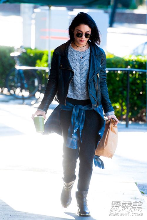 黑色皮夹克开春穿正好,配短款毛衣和紧身裤、短靴,连哈比人凡妮莎-哈金斯都变得气场十足了。