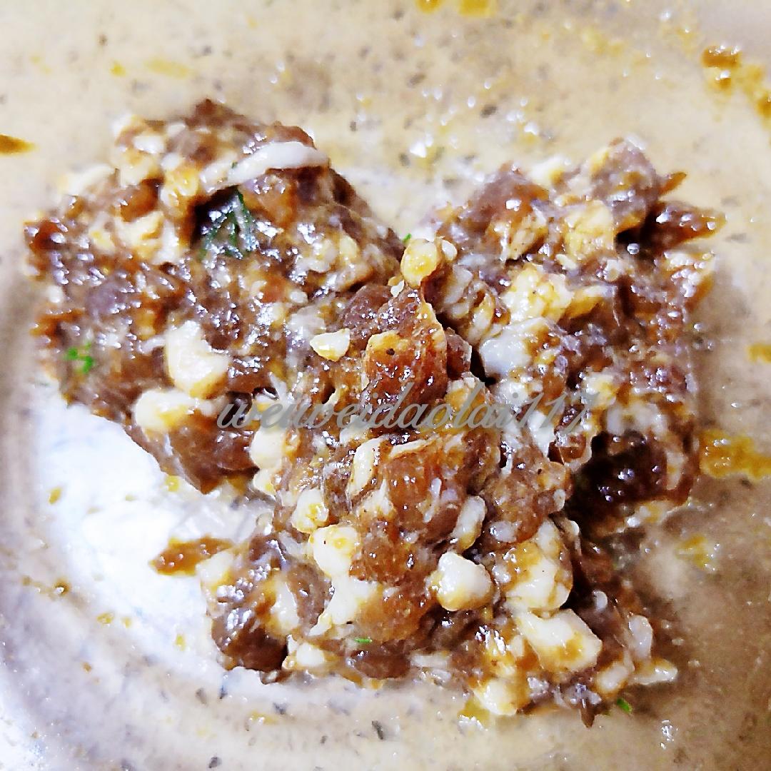 腌制肉馅儿,用配料中1/3的酱油和酒、十三香或胡椒粉、姜末、拌匀,腌制十分钟。如果没那么多调料,酱油和胡椒粉是不能少的,喜欢耗油生抽或者味极鲜的随意加哈