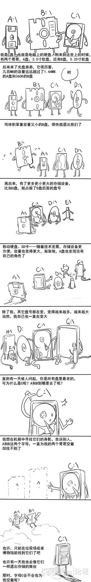 悲伤的C盘:有一天被人问起:你是所有盘里最老的,可为什么是C 呢?A和B到哪里去了?我想在机箱中寻找它们的身影,告诉别人,A和B这两个字母,一直为我的两个哥哥空着,却找不到了。也许有一天我也会像他们一样退出存储的舞台,那时字母C会不会也为我空着呢?