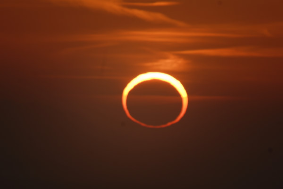 日环食则是一种更为特殊的日食,它与日全食相比还需要额外的条件。月球与太阳的直径比约为1:400,地月距离与日地距离的比值恰好也接近这个值。这也就意味着从地球上看,太阳和月球的视觉大小是相当的。而根据开普勒第一定律,天体的公转轨道其实是一个椭圆。也就是说,月球与地球的距离会时远时近。当月球离地球较远时,根据近大远小的原理,我们看到的月球就会变小。将上述情况应用到日食,如果“变小”的月球不足以遮挡住整个太阳,太阳的边缘就会像一个金色的光环一样显露出来,也就形成了我们所说的日环食。
